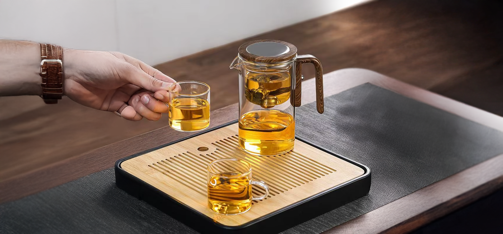 Infuse your favorite loose leaves tea with ease using our Water Separation Glass Teapot. Ergonomic and wooden-handled for a comfortably complex tea ceremony